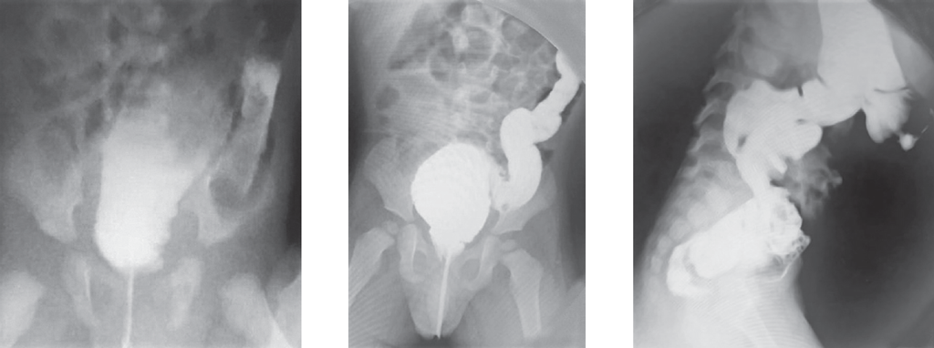 Доношенный ребенок поступил в возрасте 3 сут жизни с клиникой кишечной непроходимости: срыгивания с примесью желчи, вздутие живота, отсутствие стула. Осмотр промежности ребенка не вызвал вопросов у хирурга, по клинико-рентгенологическим данным была заподозрена болезнь Гиршпрунга. Ежедневно выполнялись очистительные клизмы. Контрастное исследование толстой кишки произведено в возрасте 14 дней жизни. По данным ирригографии выявлено резкое расширение дистального отдела сигмовидной кишки (рис. 4).