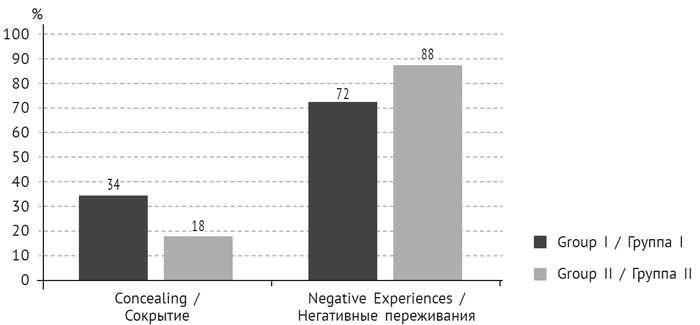 В основных группах были обнаружены различия по полу. В них негативный эмоциональный фон был более выражен у женщин. В группе 1 подобный эмоциональный фон встречался у 89,3 % женщин по сравнению с 57,1 % у мужчин (φ = 3,05, р = 0,01). В группе 2 негативный эмоциональный фон встречался у 82,6 % женщин по сравнению с 40 % у мужчин (φ = 2,745, р = 0,01).