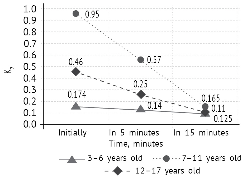 In the course of our study, exposure to ultra-weak electromagnetic waves led to a decrease in the acoustic work of respiration, and therefore to a decrease in obstructive disorders in all age subgroups of patients with mild BA. Note that with a mild course of the disease, the same direction of changes in bronchial patency was registered at both the 5th and 15th minutes of the study. The greatest decrease in K2 was recorded for patients with mild asthma of age 7–11 years (5.7 times, p < 0.05), and the smallest in an older age group (12–17 year ) – 1.4 times (p > 0.05) (Fig. 1).