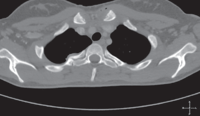 Рис. 1. Компьютерная томограмма пациентки А., 16 лет. Изменения в головке левой ключицы