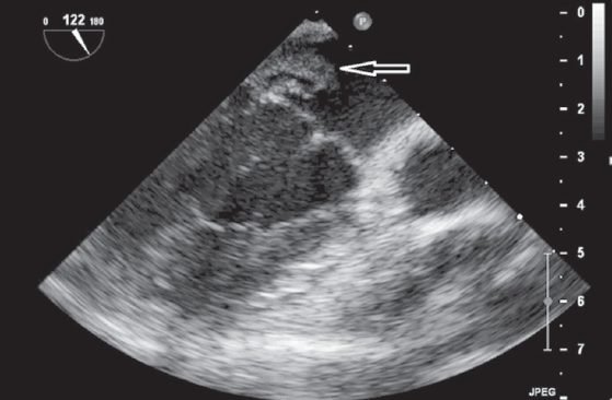 Рис. 6. Чреспищеводная эхокардиограмма пациентки А., 16 лет. Поперечная ось сердца. Стрелками указаны вегетации на задней створке митрального клапана