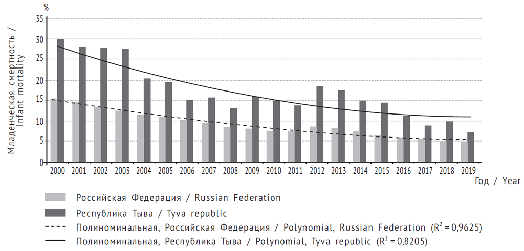 Несмотря на прогрессивное снижение числа умерших детей на первом году жизни, младенческая смертность в республике значительно превышает средние показатели по стране. Статистический анализ показателей с помощью полиномиального тренда подтверждает, что снижение младенческой смертности в Тыве с высокой степенью вероятности продолжится в течение ближайших лет, однако коэффициента аппроксимации (R2) данных в республике ниже (0,820), чем в среднем по России (0,962). После перехода нашей страны на международные критерии регистрации рождений в 2012 г. отмечался подъем младенческой смертности (8,6 ‰); но показатели уже в 2014 г. вернулись к значениям 2011 г. (7,4 ‰). В Тыве подъем уровня младенческой смертности в связи с изменением критериев регистрации новорожденных был более выраженным (18,4 ‰) и продолжительным: значения показателей 2011 г. (13,7 ‰) были достигнуты только в 2016 г.