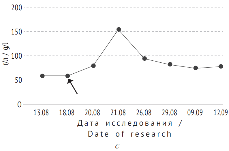 С целью протезирования функции почек в первые сутки нахождения в стационаре больному начата заместительная почечная терапия гемодиализом на временном сосудистом доступе. После верификации диагноза инициирована патогенетическая терапия первой линии — выполнено пульсовое введение 1000 мг метилпреднизолона внутривенно в течение 3 дней с последующим переходом на пероральный прием 48 мг таблетированного Метипреда. Также выполнялись внутривенные инфузии циклофосфамида в режиме 400 мг 1 раз в 2 нед. (суммарно 1200 мг), получал гидроксихлорохин в дозе 400 мг в сутки. После начала патогенетического лечения отмечалось улучшение лабораторных и инструментальных показателей — уменьшение выраженности гематологических нарушений (см. рисунок), снижение азотемии, нормализация уровеня С-реактивного белка. При повторных рентгенологических исследованиях отмечался регресс инфильтративных изменений в легких, резорбция плеврального выпота, в том числе по данным УЗИ.