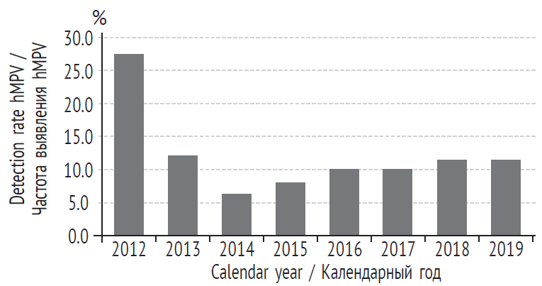 Fig. 1. Dynamics of detection by years of metapneumovirus (hMPV) infection in hospitalized children in the period 2012–2019 / Рис. 1. Динамика выявления по годам метапневмовирусной (hMPV) инфекции у госпитализированных детей в период c 2012 по 2019 год