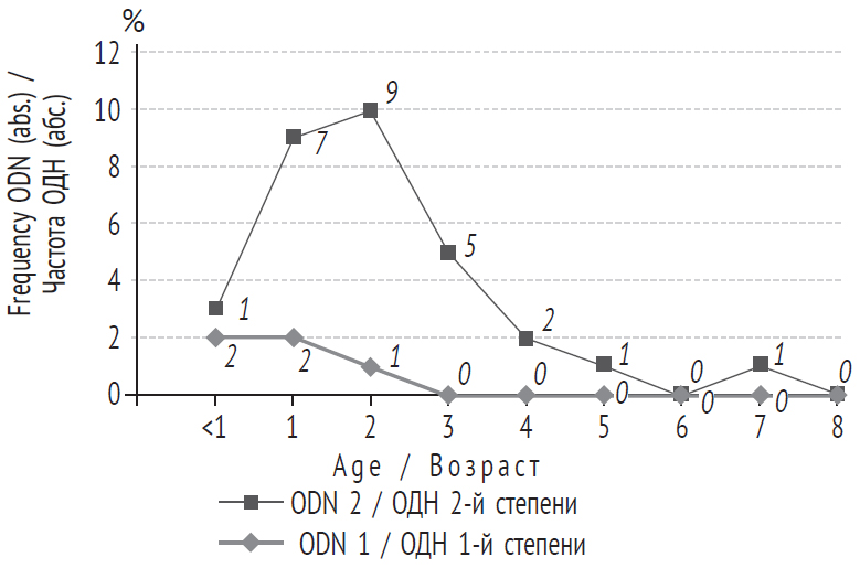 Fig. 4. Frequency and severity of acute respiratory failure in etapneumovirus infection (n = 31) / Рис. 4. Частота и степень выраженности острой дыхательной недостаточности (ОДН) при метапневмовирусной инфекции (n = 31)