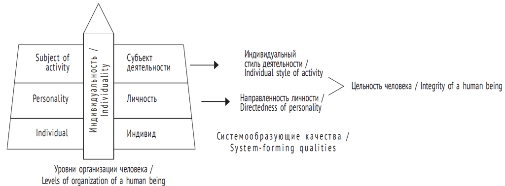 Б.Г. Ананьев, исследуя структуру человека, ввел понятие индивидуальности, характеризующее, по его мнению, глубину личности. Он подчеркивал, что именно в индивидуальности «замыкается внутренний контур регулирования всех свойств человека как индивида, личности <…> и субъекта различных деятельностей» [5]. Указание Б.Г. Ананьева, что «индивидуальность — это „глубина“ личности и субъекта деятельности», по нашему мнению, подчеркивает ее функциональный характер [5]. Индивидуальность можно представить в виде некоего вектора, «пронизывающего» все уровни в структуре человека — индивида, личности и субъекта деятельности. Каждый человек всегда есть и индивид, и личность, и субъект безотносительно к степени сформированности или выраженности соответствующих качеств и свойств. Однако далеко не каждый при этом индивидуальность не в смысле отдельных индивидуальных отличий на каждом из уровней человеческой организации, а в смысле их единства. Именно это единство является основой для максимально полного развития и выражения человеком своих способностей, качеств и свойств, когда человек, говоря словами Гегеля, «вкладывает свою сущность в произведенное», внося, тем самым, свой собственный неповторимый вклад в общественное развитие. Индивидуальность выражает единство всех уровней организации человека (см. рисунок).