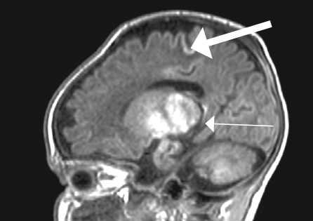 Рис. 2. Магнитно-резонансная томограмма головного мозга пациента, сагиттальный срез. Визуализируется гиперинтенсивный сигнал в области базальных ядер (тонкая стрелка), прецентральной извилины (толстая стрелка) / Fig. 2. Patients brain, magnetic resonance imaging, sagittal. Abnormal T1 hyperintensity is presented at the level of thalamic (thin arrow), motor cortex (thick arrow)