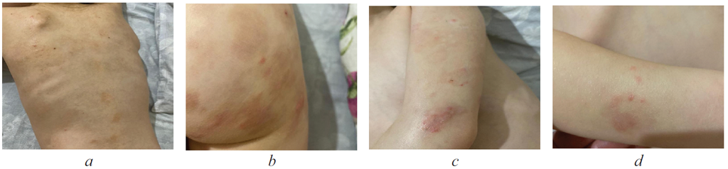 Рис. 3. Фото пациентки М., 2015 г. р., страдающей герпетиформным дерматитом Дюринга (на фоне терапии, 10-й день): a — регресс патологического процесса на коже спины; b — ягодиц; c, d — верхних конечностей / Fig. 3. Photo of patient M., born in 2015, suffering from Duhring’s dermatitis herpetiformis (during therapy, 10 day): a – regression of the pathological process on the skin of the back; b – buttocks; c, d – upper limbs