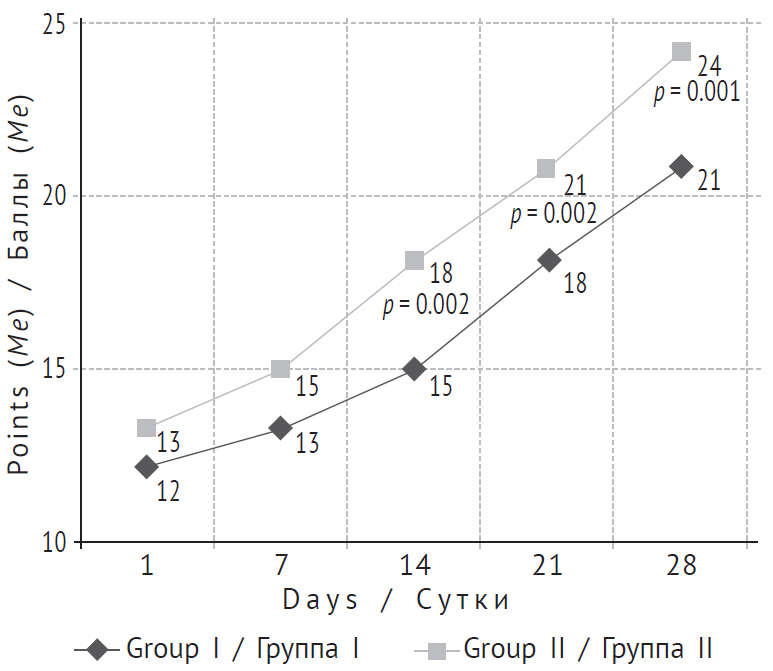 Score for scale Silverman, points / Оценка по шкале Сильвермана, балл | 6 [6; 7] | 5 [5; 6] | 0.001 |