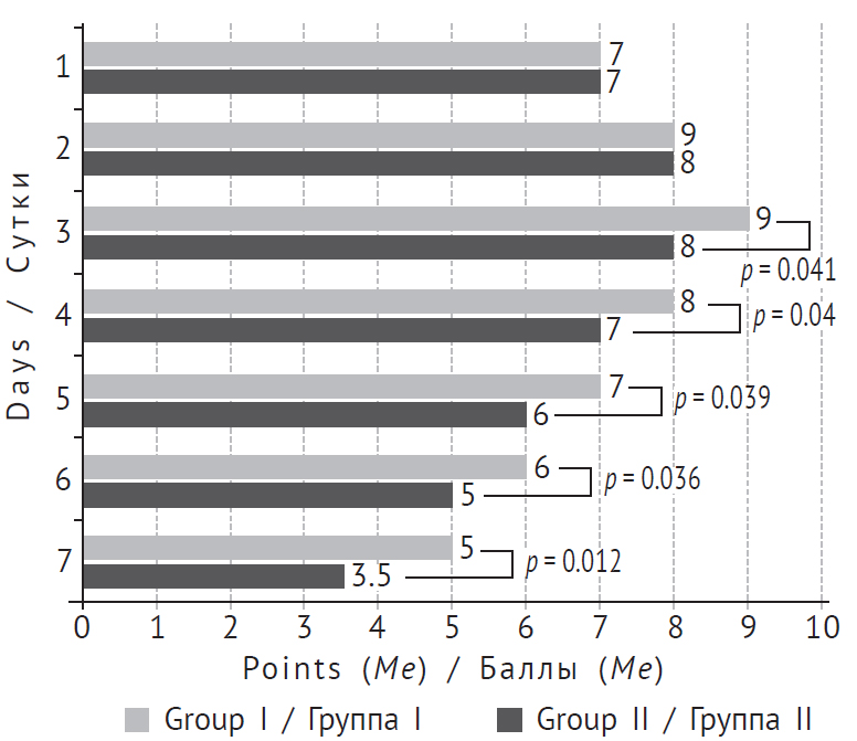 In the first two days, the pain level in patients of both groups was also statistically indistinguishable (p > 0.05). The maximum pain intensity in children of the group I was noted on the third day of life, and the EDIN6 score was 9. Starting from the third day of life until the end of the early neonatal period, the intensity of pain was significantly higher in children of group I (p < 0.05).