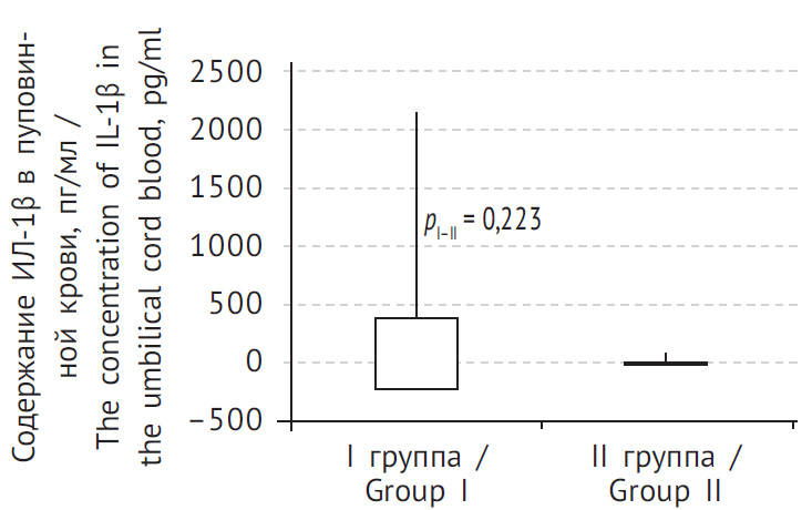 Рис. 1. Содержание ИЛ-1β в пуповинной крови у обследованных новорожденных. Группа I — дети, рожденные у матерей с хориоамнионитом; группа II — группа сравнения (здоровая пара мать – ребенок)