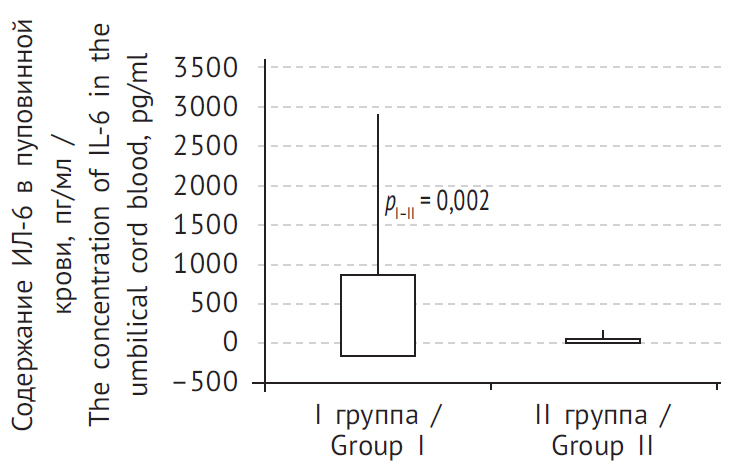 Рис. 2. Содержание ИЛ-6 в пуповинной крови у обследованных новорожденных. Группа I — дети, рожденные у матерей с хориоамнионитом; группа II — группа сравнения (здоровая пара мать – ребенок)