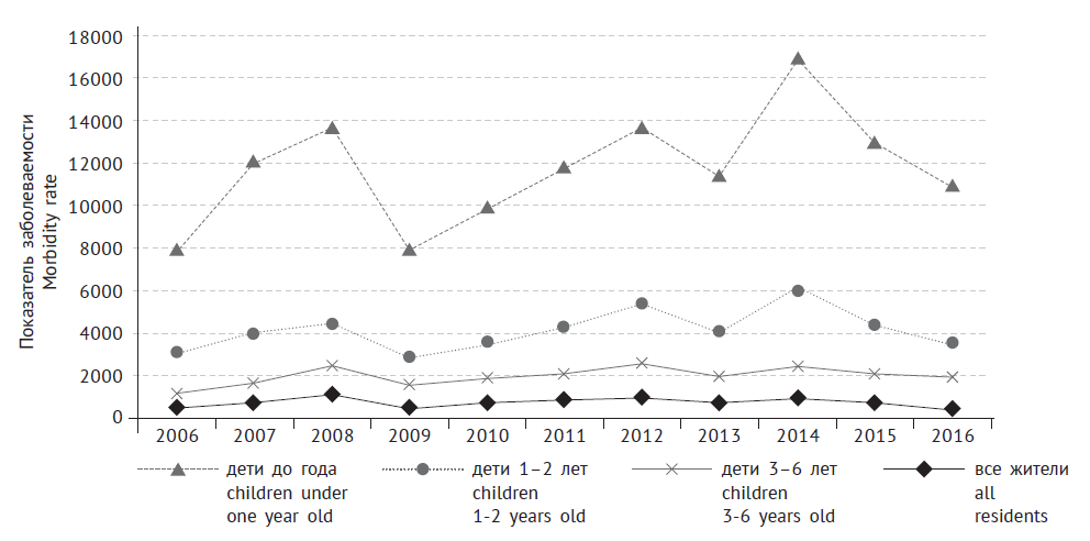 Ветряная оспа — типичная детская инфекция. Большинство населения переболевает ею до 14 лет. Заболеваемость ветряной оспой до сих пор сохраняется на стабильно высоком уровне, болеют дети различного возраста, в том числе новорожденные, а также взрослые [7, 11]. Заболеваемость ветряной оспой у детей дошкольного возраста, по данным Роспотребнадзора, по Санкт-Петербургу представлена на рис. 1.