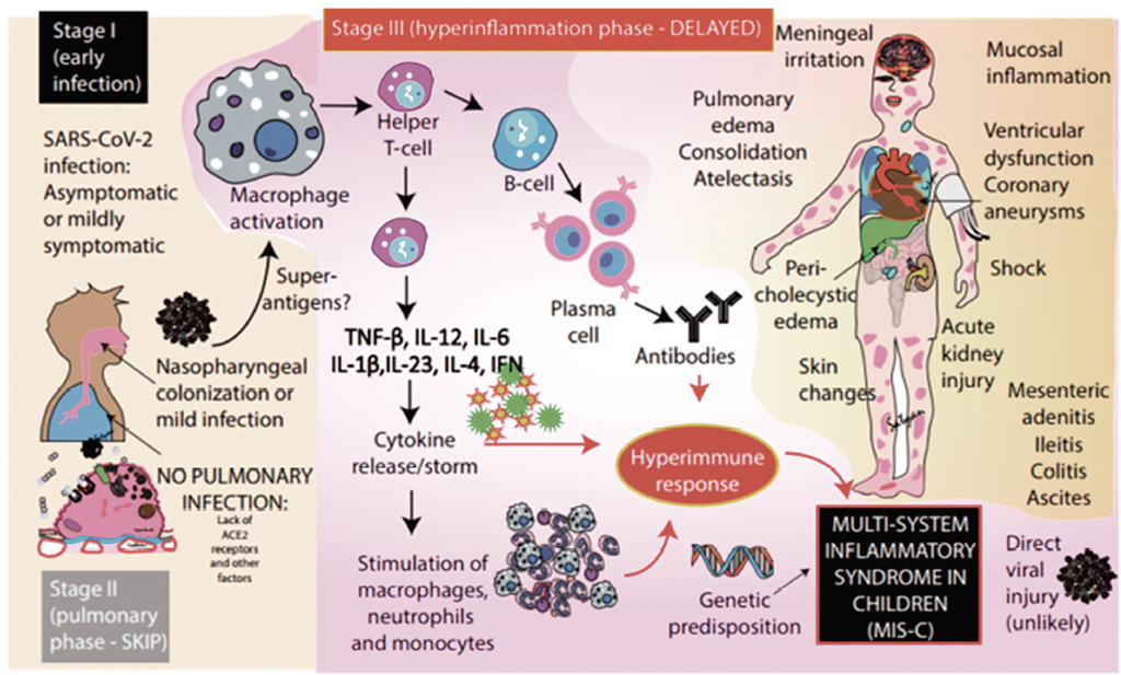 In most cases, MIS-C developed 2–4 or 2–6 weeks after the acute phase of COVID-19 [9, 15, 21]. This new postviral systemic inflammatory disease supposedly arises from an excessive adaptive immune response of the body [26]. In this regard, the researchers call for alertness of the clinicians regarding the cytokine release syndrome associated with the COVID-19 [56]. The revealed relationship between MIS-C and COVID-19 infection suggests that the pathogenesis of MIS-C proceeds according to the postinfectious immune dysregulation type [37].