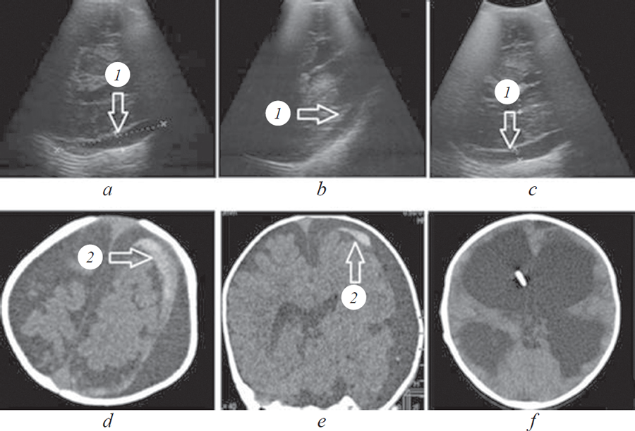 Рис. 1. Мальчик А.Р., 7 месяцев. Закрытая черепно-мозговая травма. Ушиб головного мозга средней степени тяжести. Суб арахноидальное кровоизлияние. Органическое поражение ЦНС. Сообщающаяся тривентрикулярная гидроцефалия. Субдуральные скопления в лобно-теменно-височных областях с двух сторон: a — УС-изображение в режиме S3,5 (доступ через височную кость, H2) через 8 часов после травмы; b — УС-изображение в режиме S3,5 (доступ через лобную кость); c — УС-изображение в режиме S3,5 (H2) через 72 часа после травмы; d, e — КТ головного мозга через 10 часов после травмы; f — КТ головного мозга через 16 дней. 1 — субдуральное скопление; 2 — участок кровоизлияния (указано стрелкой)