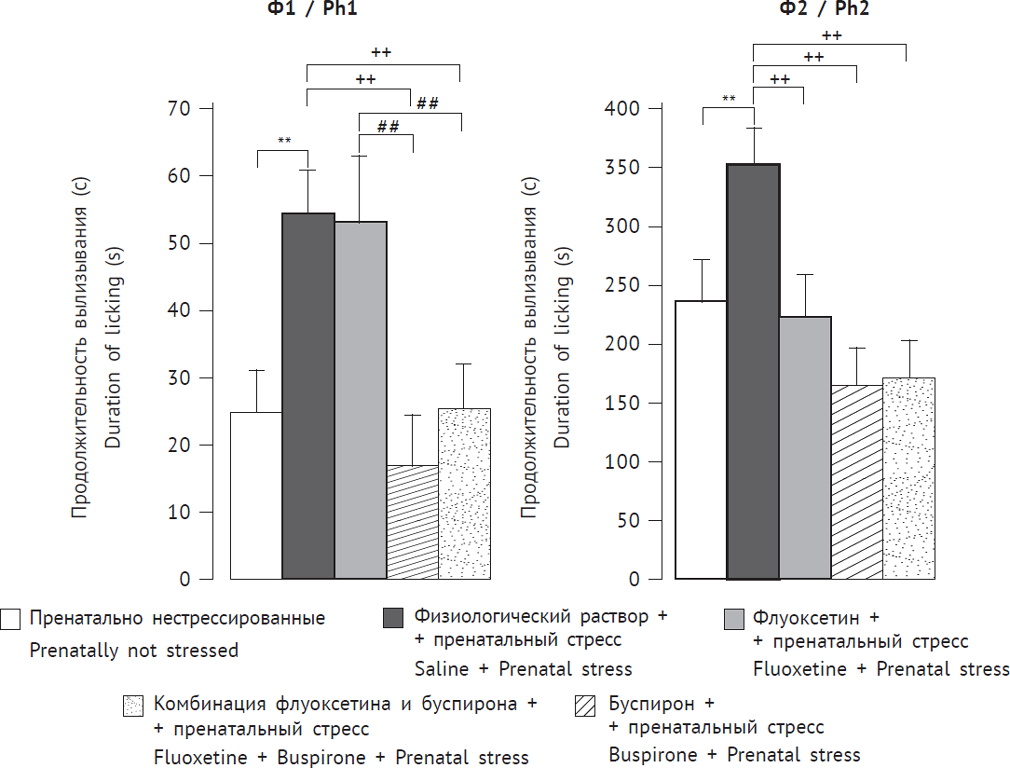 Рис. 2. Влияние инъекций флуоксетина, буспирона и комбинации этих препаратов самкам крыс во время беременности на продолжительность вылизывания в первую острую (Ф1) и вторую тоническую (Ф2) фазы формалинового теста у женского потомства в препубертатный период развития: **p < 0,01 — между пренатально стрессированными с введением физиологического раствора и пренатально не стрессированными; ++p < 0,01 — между пренатально стрессированными с введением препаратов и пренатально стрессированными с введением физиологического раствора; ##p < 0,01 — между флуоксетин + пренатальный стресс и комбинацией флуоксетина и буспирона + пренатальный стресс и между буспирон + пренатальный стресс